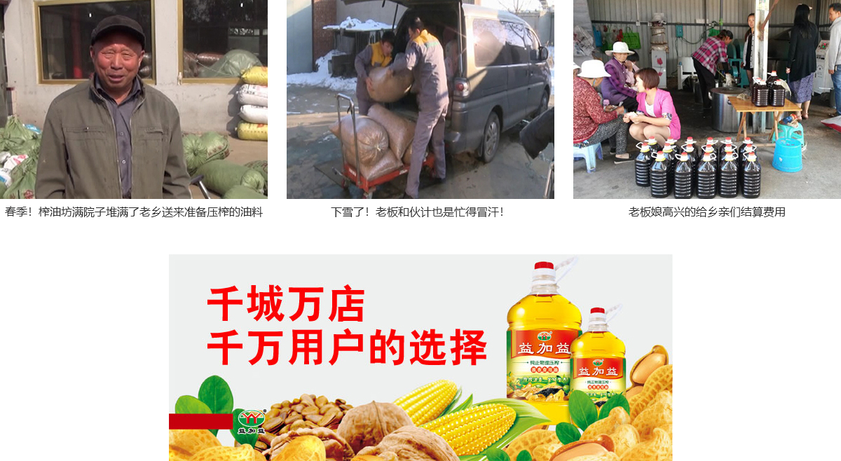 開榨油坊不必再背井離鄉去外地打工,只需購買益加益榨煉一體化榨油機設備,農忙時候干農活,農閑時候榨油賺錢,兩頭兼顧,還可以和家人享受天倫之樂。通過來料加工,接收周邊農戶送來的油料即可實現邊壓榨邊煉油,煉出的油品濃香鮮純,原汁原味,下鍋不起沫,油坊按照壓榨油料的重量或出油量收取加工費,或者為農戶免費榨油,出售壓榨后的油餅作為收入,這些都是致富的好門路,既幫鄉親們吃上好油,自己也賺了加工費。